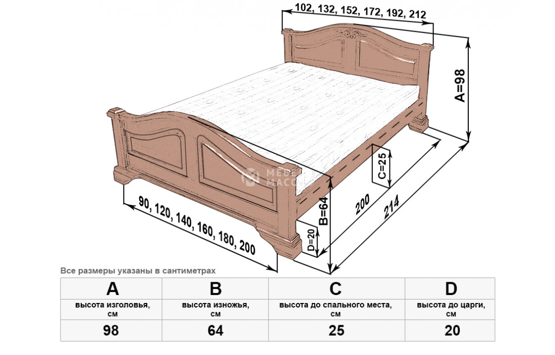 Королевская кровать Европа мод 1 изготовлена из натурального древесного массива. Модель имеет прочную конструкцию и благородный вид. Изделие, которое можно купить по выгодной цене в нашем интернет-магазине, отличается сплошными симметричными волнообразными спинками, переходящими в устойчивые ножки. Осуществляется доставка на дом по Невиномысску и Ставропольскому краю .| Размер | Цена | |