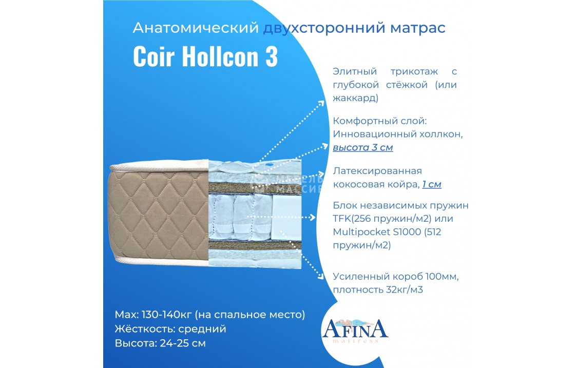 двусторонний Coir Hollcon 3 / Sisal Hollcon 3 от фабрики афина с пружинным блоком tfk-256 (256 пружин на кв. метр) или multi-512 (512 пружин на кв. метр) на выбор. чехол жаккард стёганный 180-220 гр/м2 или элитный трикотаж с объёмной стёжкой 300гр/м2 на выбор. купите по цене производителя в интернет-магазине мебель массив.| Размер | Цена | |
