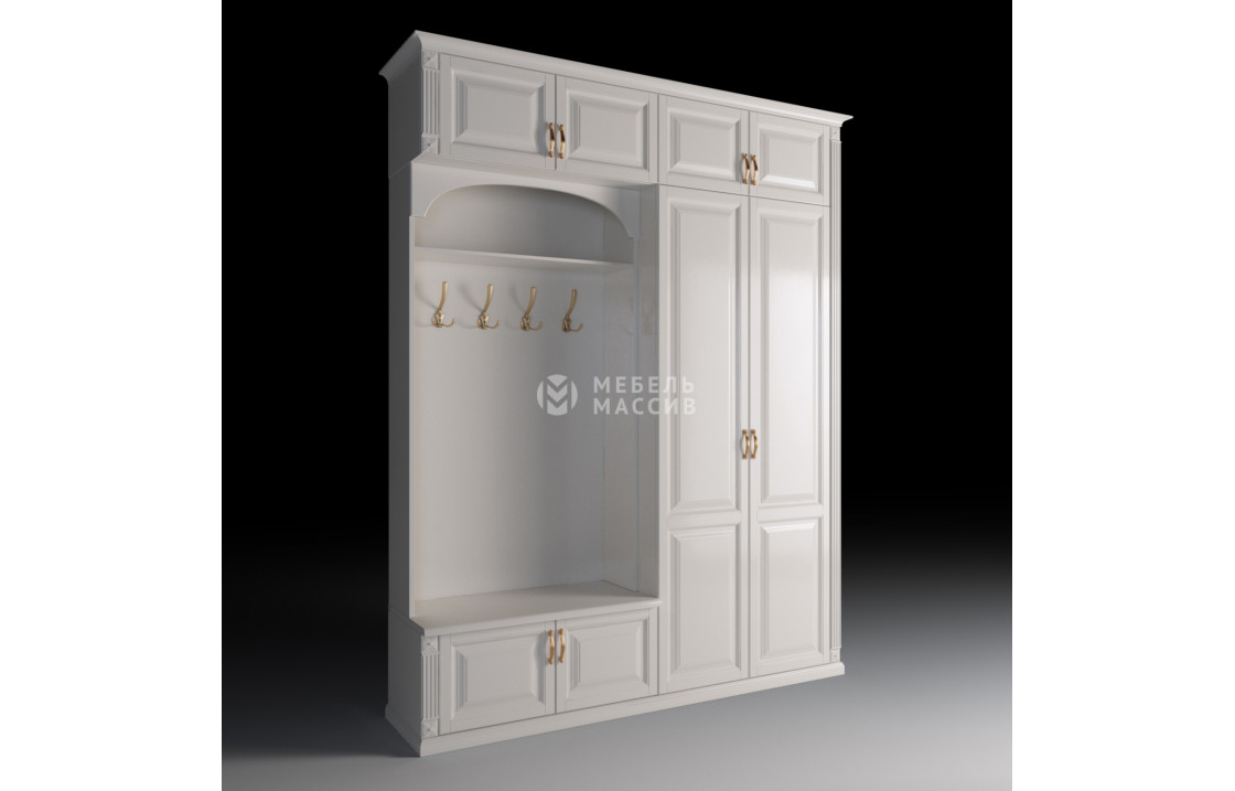 Прихожая Ронда отличается высокой вместительностью: модель имеет открытую нишу с полкой и крючками для верхней одежды, двустворчатый шкаф с перекладиной и несколько дополнительных шкафчиков. Изделие, которое можно купить по лучшей цене в нашем интернет-магазине, сделано из древесного массива.| Размер | Цена | |